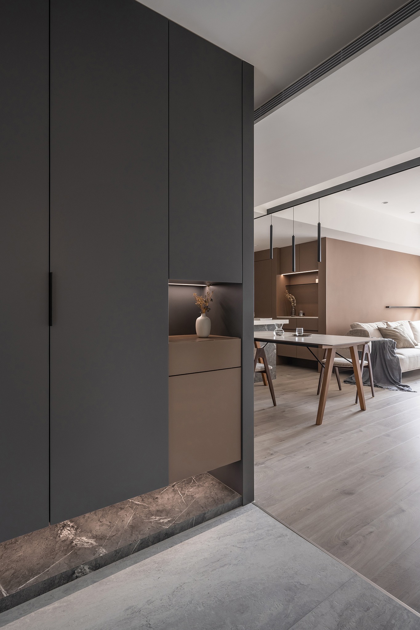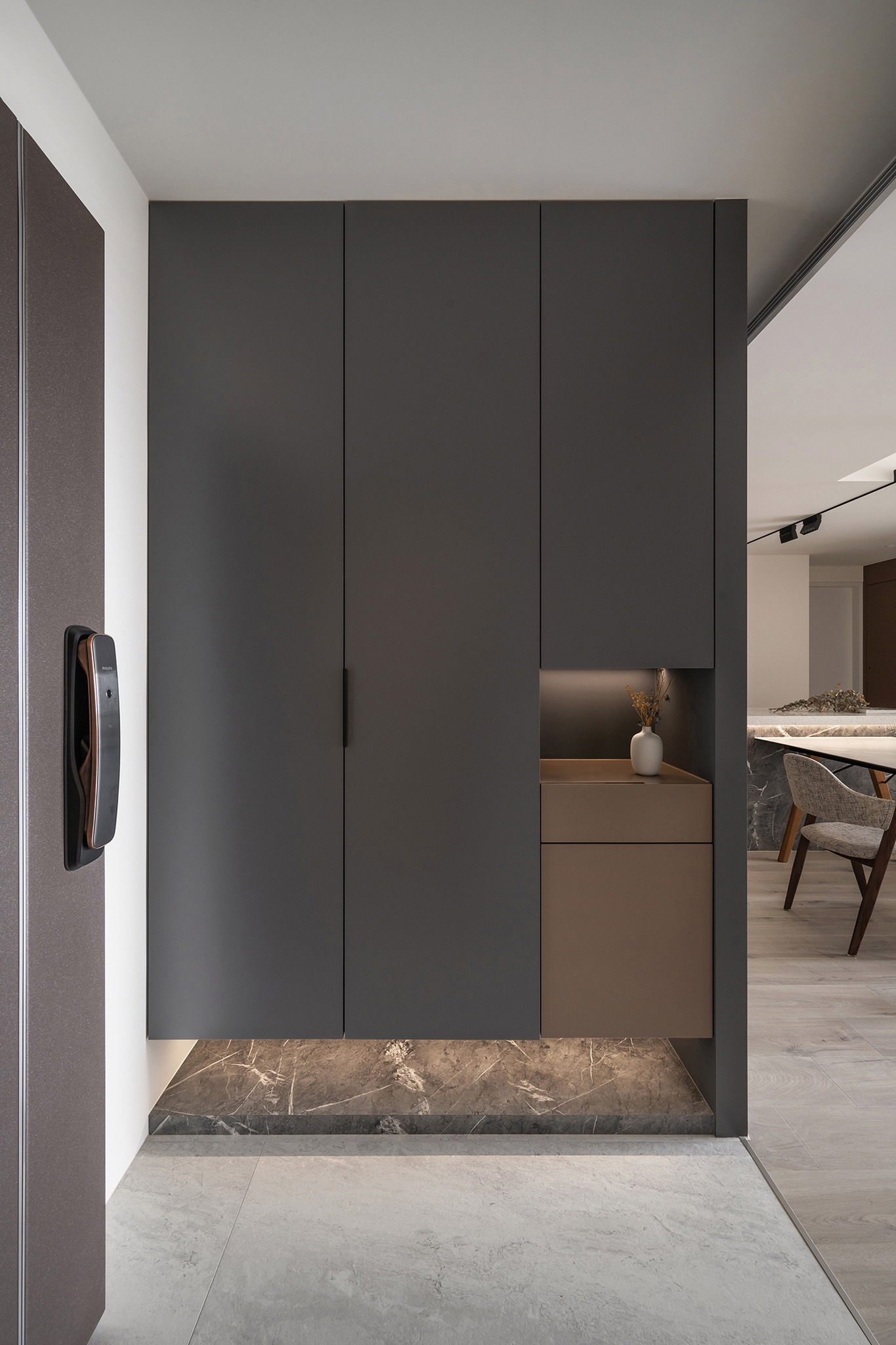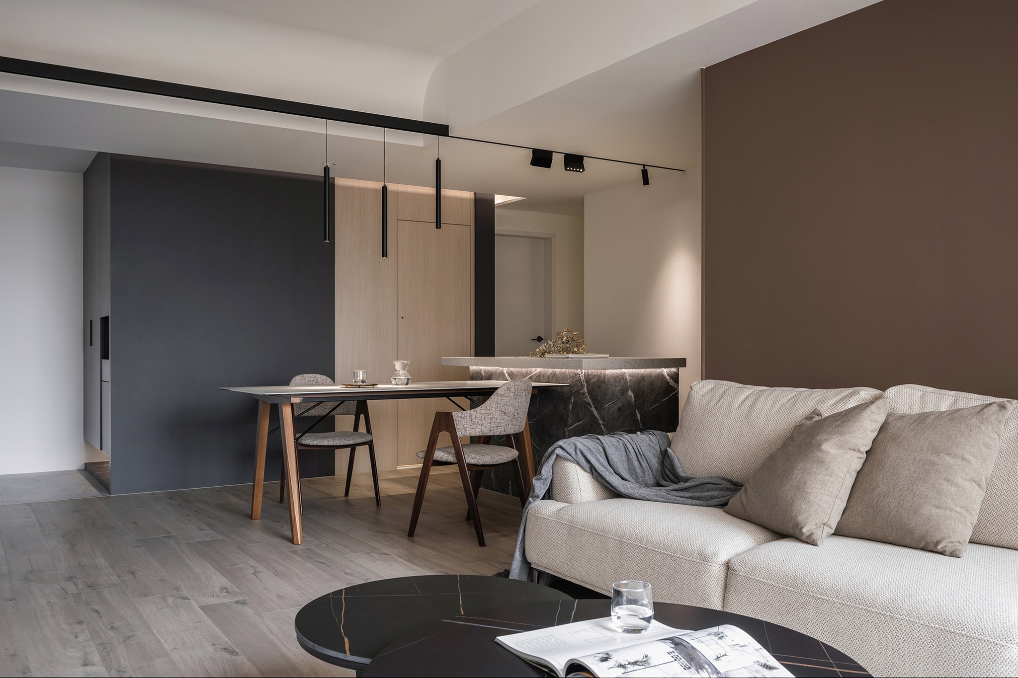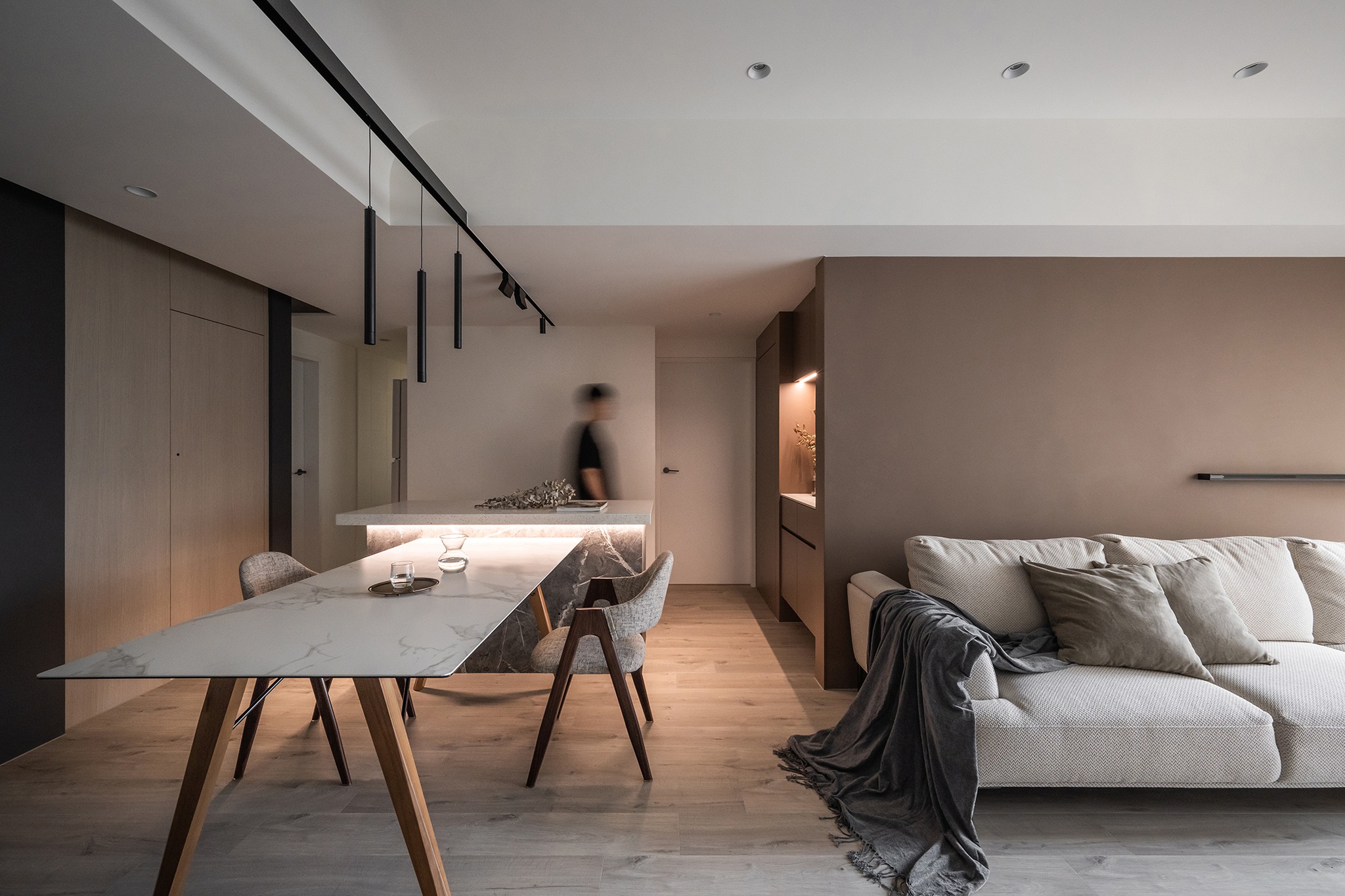 在規(guī)劃布局上,設(shè)計(jì)師以中島和餐桌為中心,構(gòu)建了流暢的回字動線,使整個空間更加通暢和寬敞。與此同時(shí),還設(shè)計(jì)了隱藏的倉庫空間,滿足了充沛的收納需求,確保家居整潔有序。