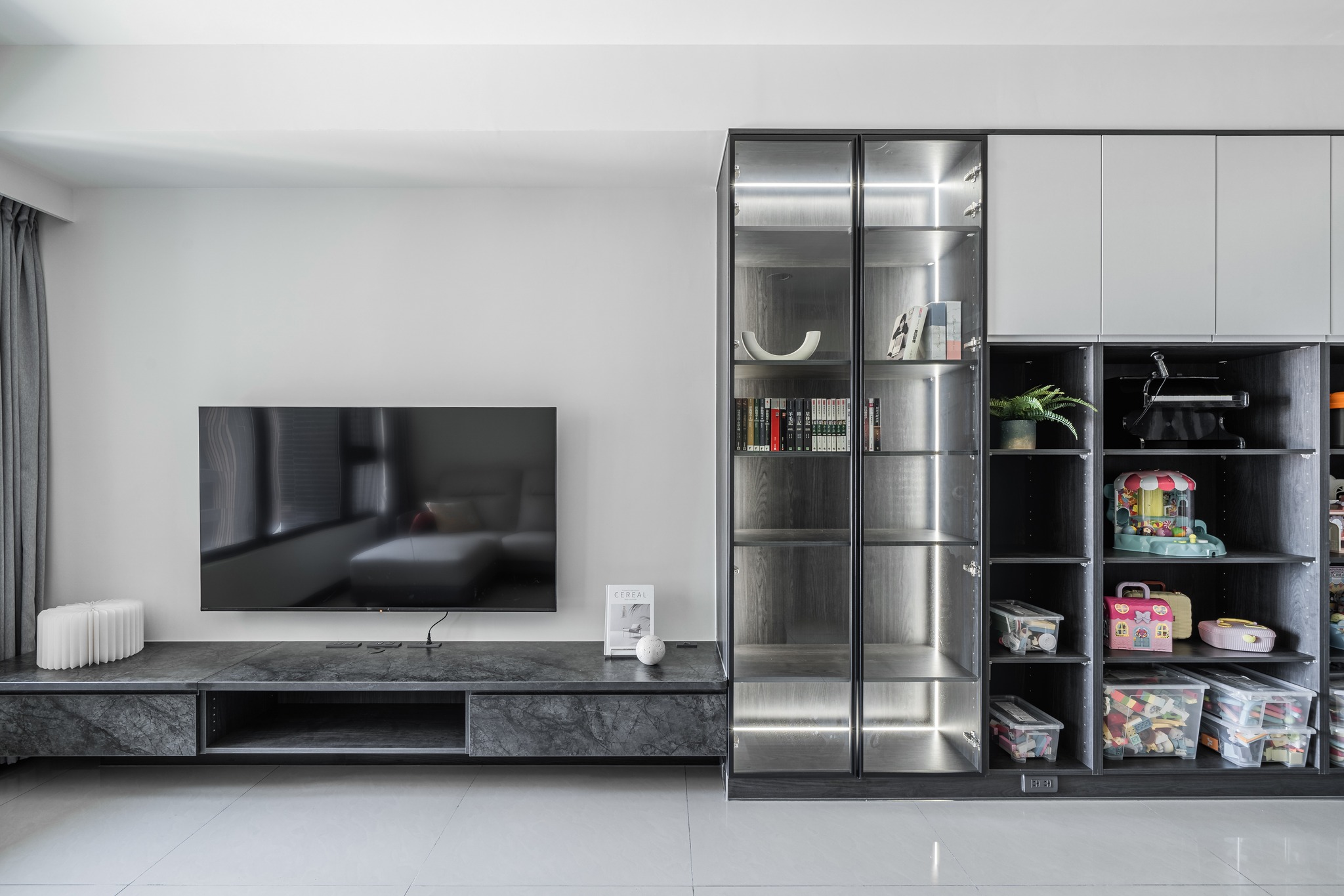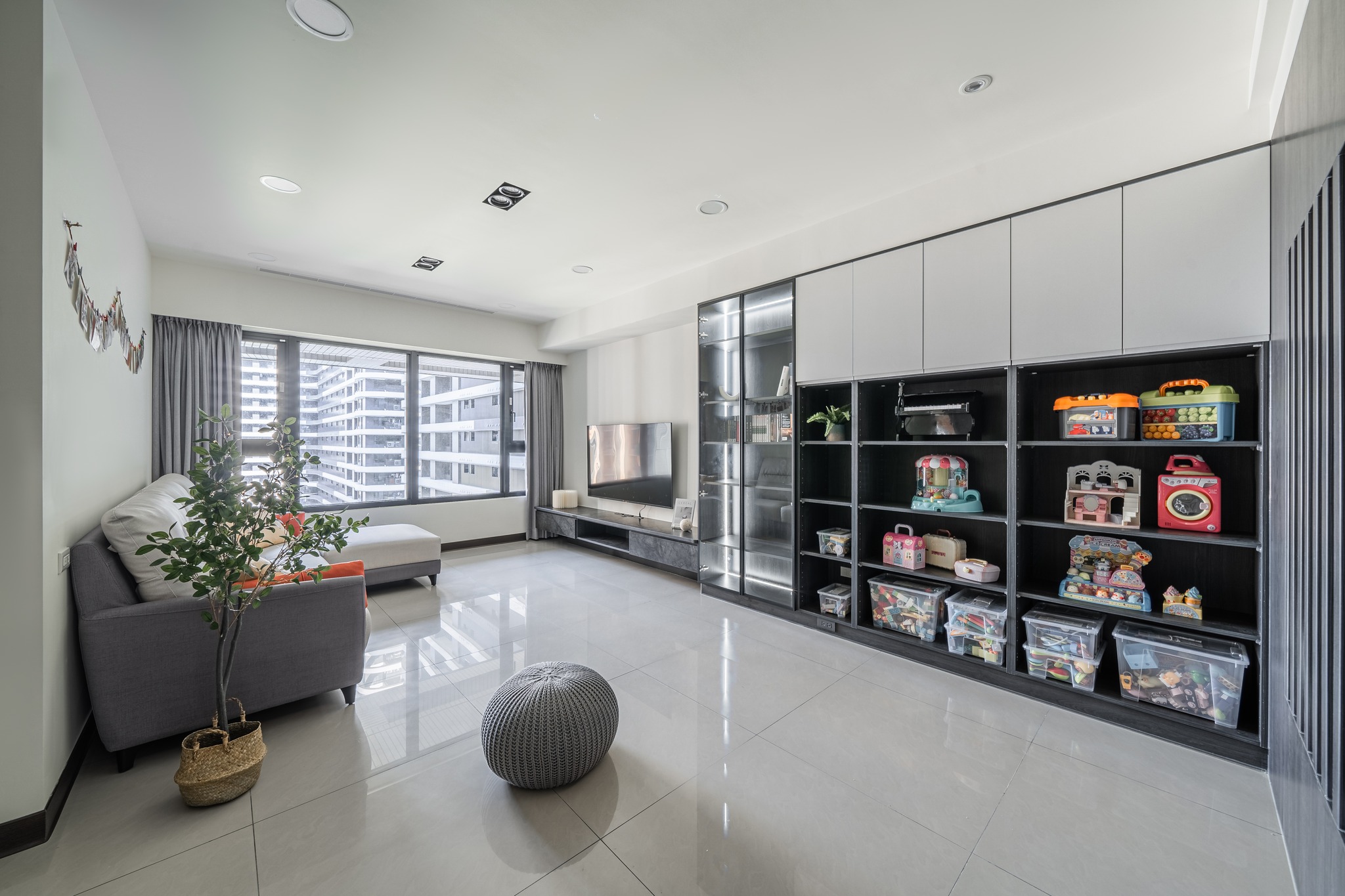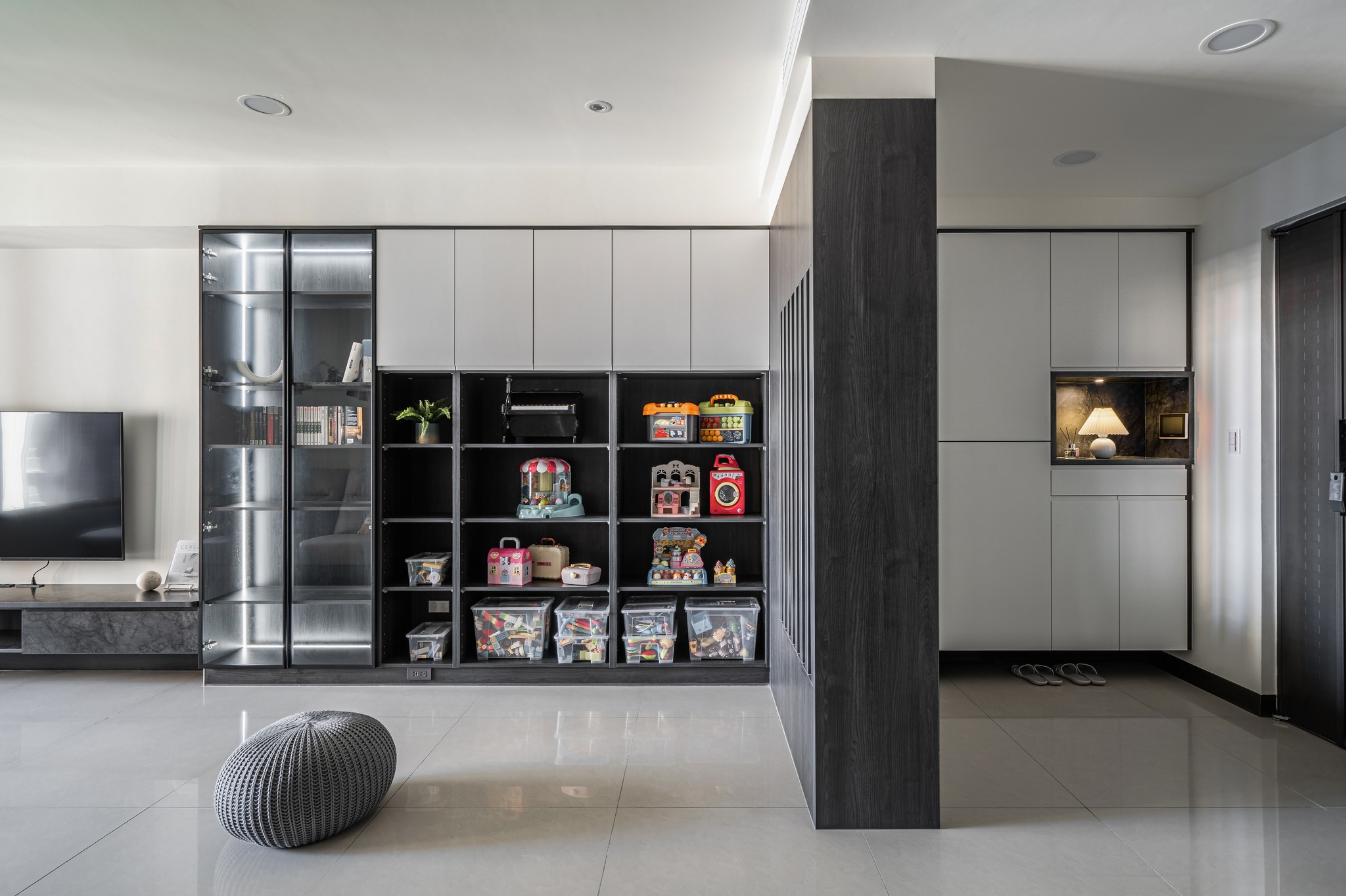 在家庭中,收納常常是一個(gè)挑戰(zhàn),尤其是有孩子的家庭。為了解決這個(gè)問(wèn)題,我們?cè)谛P(guān)區(qū)域設(shè)置了開(kāi)放式的層架區(qū)。這個(gè)區(qū)域不僅用來(lái)收納孩子心愛(ài)的玩具,還設(shè)有游戲墊,成為孩子的專屬游戲區(qū)。層架設(shè)計(jì)既滿足了收納的需求,又為孩子提供了一個(gè)自由發(fā)揮的空間,使整個(gè)家庭充滿活力與溫馨。