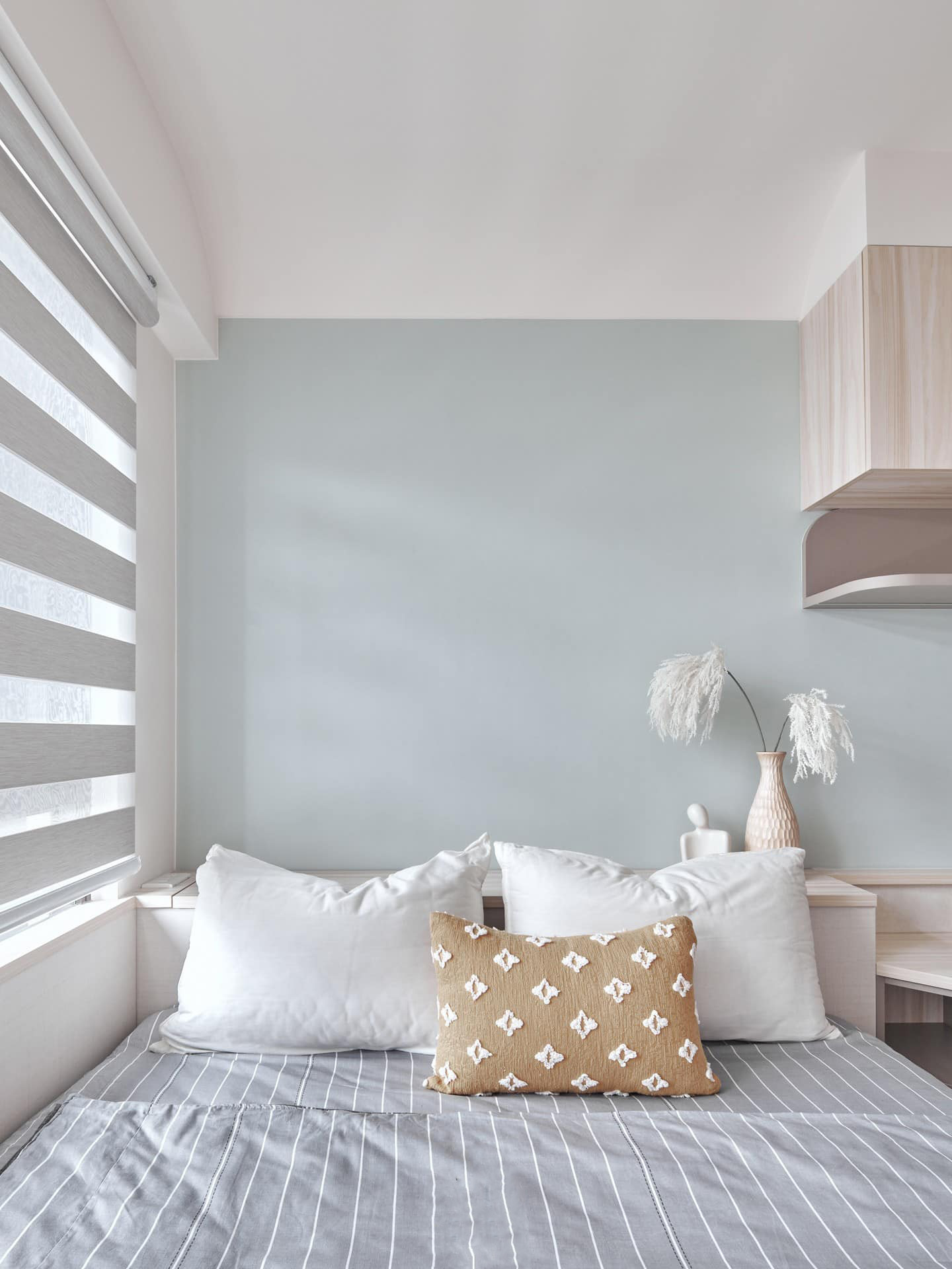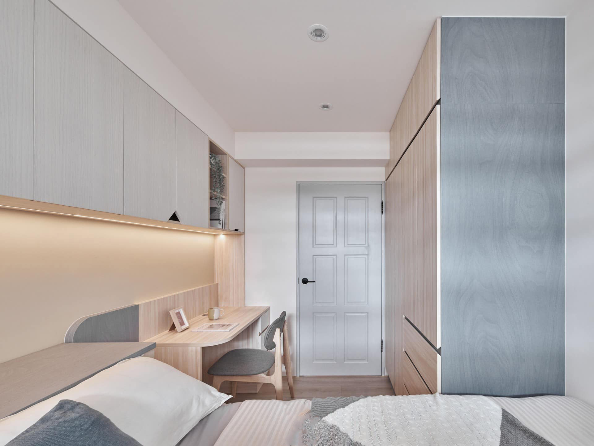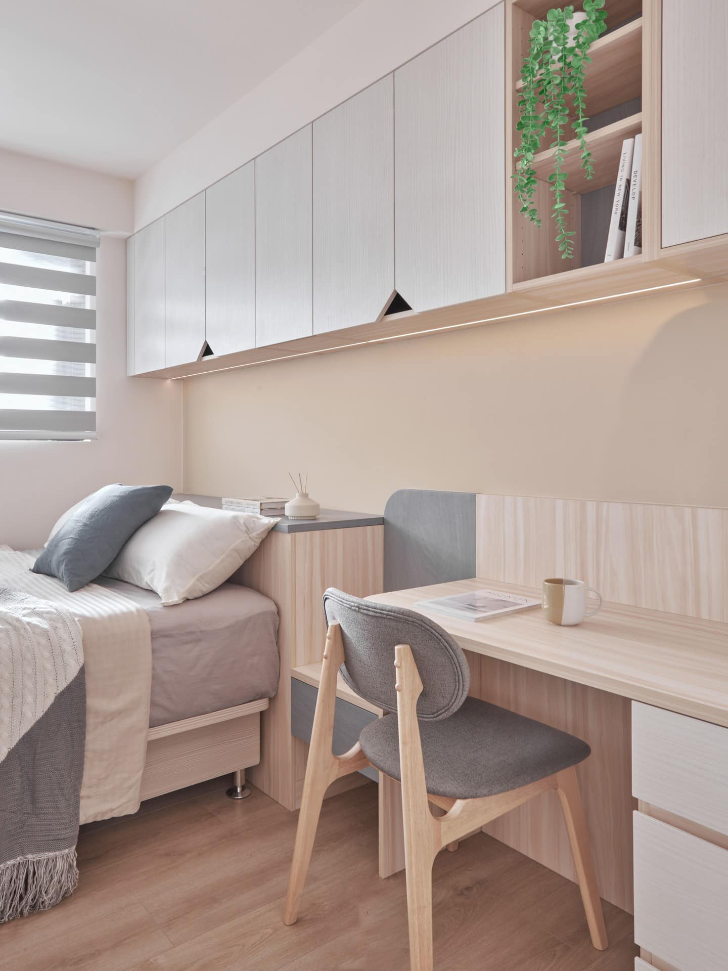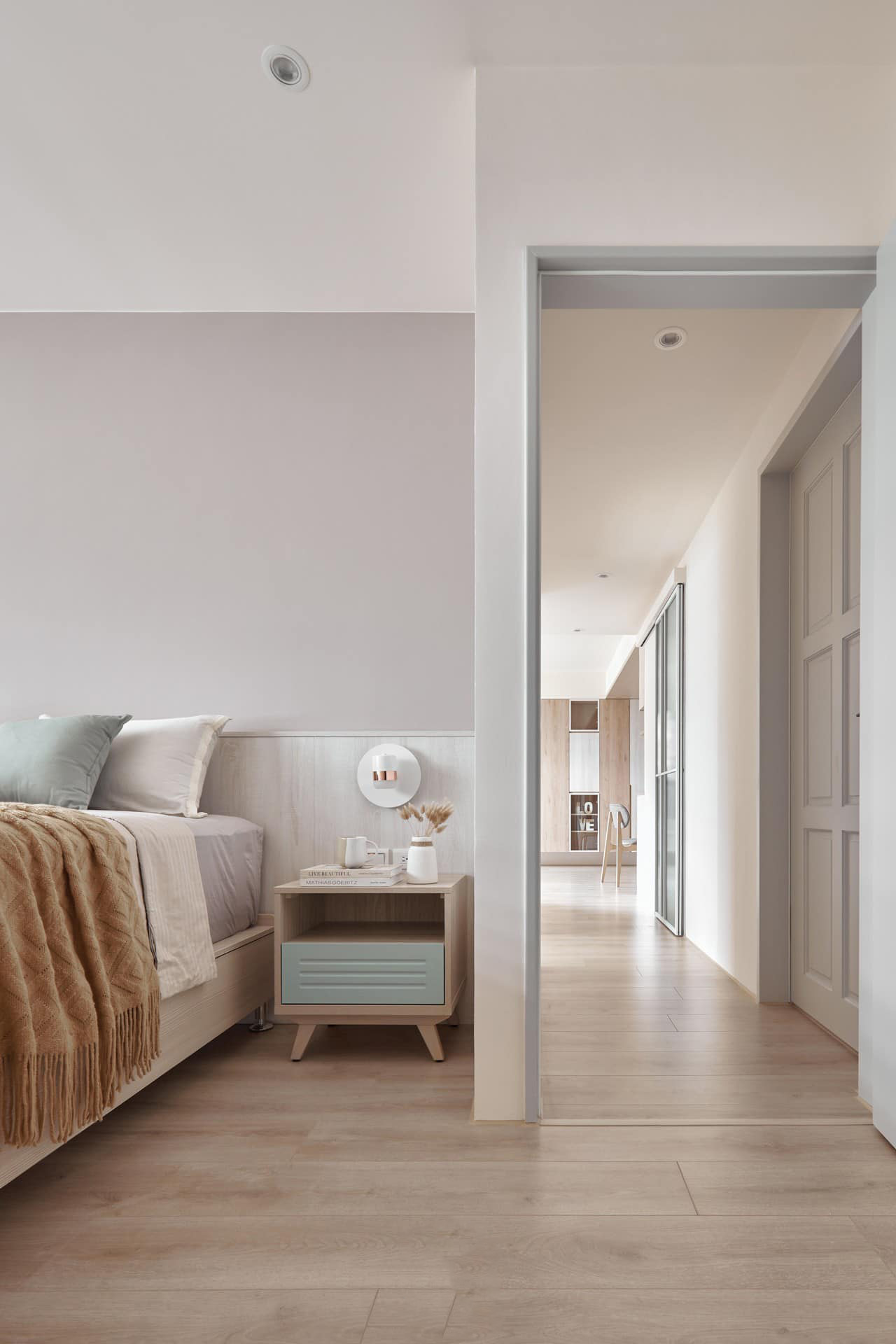 臥室的設計延續(xù)了奶茶色原木的主題,選擇深淺不一的奶茶色床品,為空間增添了一抹柔美的氣息。原木床頭柜和北歐設計的吊燈巧妙地融入其中,打造出一個宜人而舒適的臥室環(huán)境。