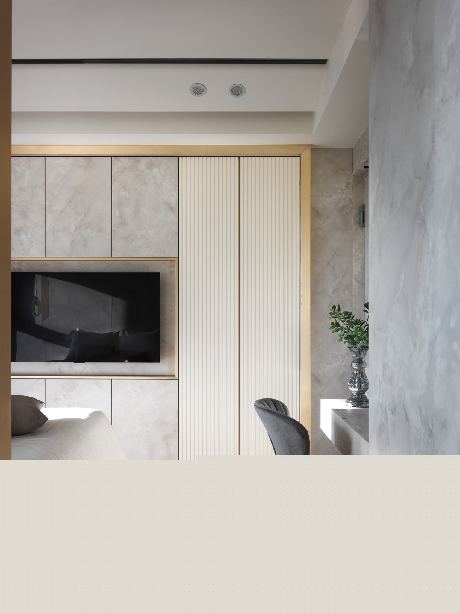 在這個(gè)150平米的室內(nèi)空間中,溫潤(rùn)的奶茶色調(diào)與鈦金屬線(xiàn)條與淺石紋牆面相得益彰,勾勒出一幅明亮而蘊(yùn)含輕奢氛圍的設(shè)計(jì)畫(huà)卷。